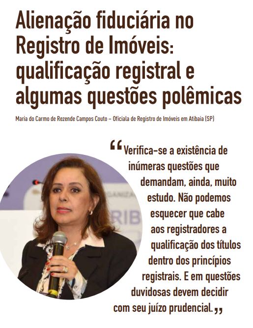 Dentre os mais variados temas, destaca-se o artigo decorrente da palestra apresentada pela Registradora de Imóveis da Comarca de Atibaia/SP, Maria do Carmo de Rezende Campos Couto, que versou acerca da alienação fiduciária, com enfoque em questões polêmicas decorrentes da qualificação registral deste tipo de garantia.