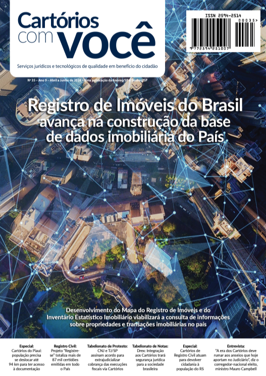 A Associação dos Notários e Registradores do Brasil (ANOREG/BR) disponibilizou em seu site a edição n. 35 – Ano 9 – Abril a Junho de 2024 da revista “Cartórios Com Você”. A revista é uma publicação trimestral do Sindicato dos Notários e Registradores do Estado de São Paulo (SINOREG-SP) e da Associação dos Notários e Registradores de São Paulo (ANOREG-SP) e traz como matéria de capa o avanço na construção da base de dados imobiliária nacional pelo Registro de Imóveis do Brasil (RIB).