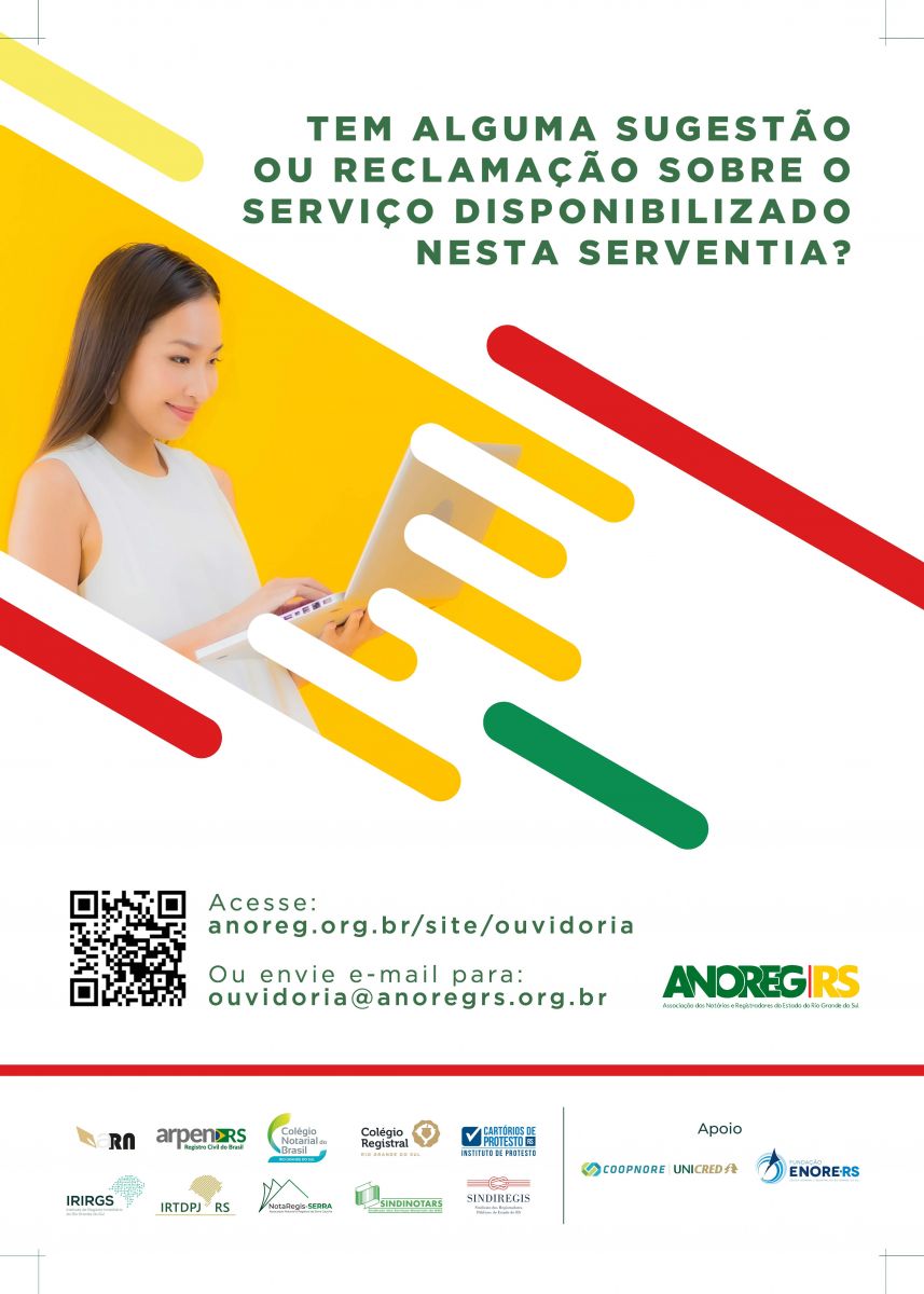 A Associação dos Notários e Registradores do Estado do Rio Grande do Sul (ANOREG/RS) e o Fórum de Presidentes das Entidades Extrajudiciais gaúchas reforçam a importância da disponibilização do regulamento da Ouvidoria da Associação. O canal é destinado para receber sugestões e reclamações dos serviços prestados nas Serventias Extrajudiciais do Estado.