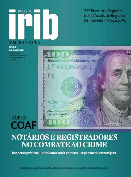 O Instituto de Registro Imobiliário do Brasil (IRIB) encaminhou a versão impressa do Boletim do IRIB em Revista n. 364 (BIR) pelos Correios aos seus Associados. O BIR consolida as palestras apresentadas no curso “COAF – Notários e Registradores no combate ao crime – Aspectos práticos, problemas mais comuns – repensando estratégias”, realizado pela Corregedoria Nacional de Justiça do Conselho Nacional de Justiça (CN-CNJ) e pela Escola Paulista da Magistratura de São Paulo (EPM) e no “37º Encontro Regional dos Oficiais de Registro de Imóveis do Brasil”, realizado pelo IRIB em Maceió/AL.