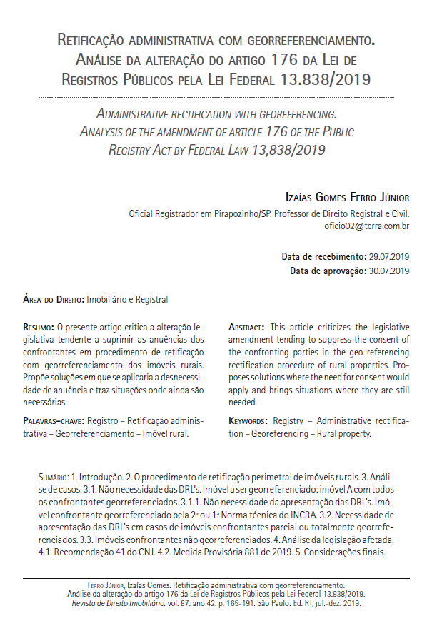 Retificação administrativa com georreferenciamento. Análise da alteração do artigo 176 da Lei de Registros Públicos pela Lei Federal 13.838/2019