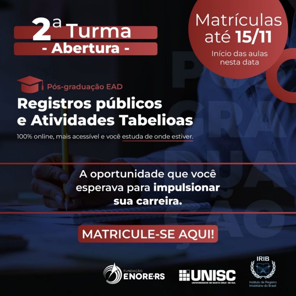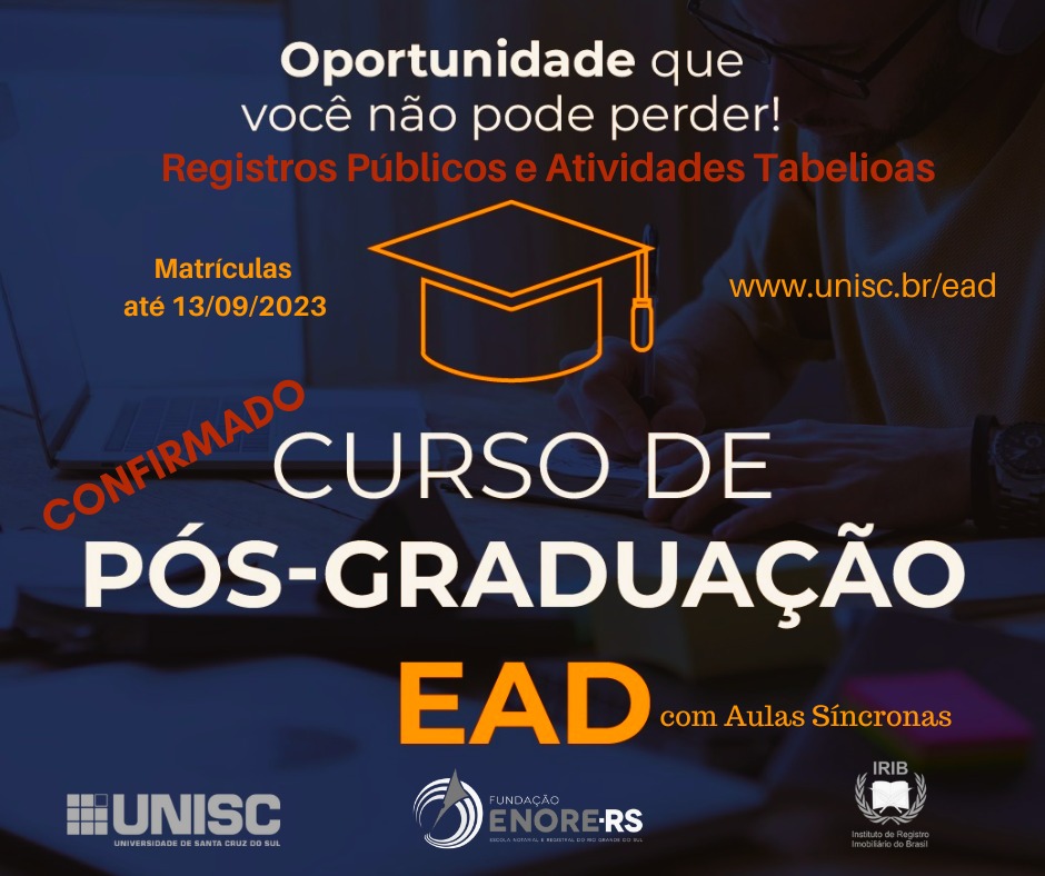 Curso é oferecido em parceria pela UNISC, pela ENORE-RS e pelo IRIB. Matrículas poderão ser realizadas até o final de agosto!
