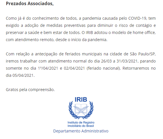 Veja como funcionará o expediente do IRIB em virtude da antecipação dos feriados
