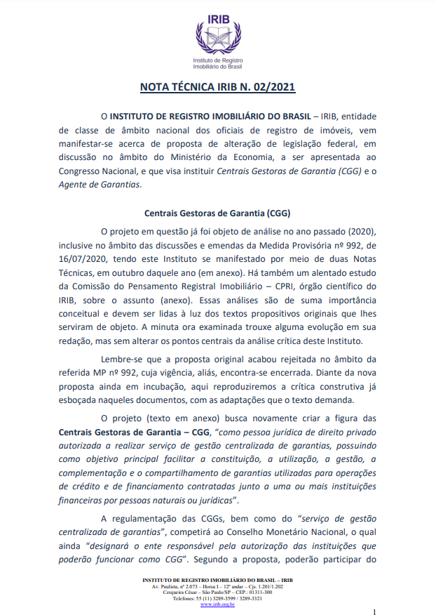 IRIB encaminha NOTA TÉCNICA N. 02/2021 às autoridades dos Poderes Legislativo e Judiciário