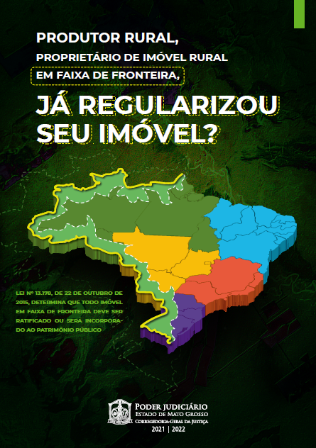 A Corregedoria-Geral da Justiça do Estado de Mato Grosso (CGJMT) publicou a cartilha “JÁ REGULARIZOU SEU IMÓVEL?”, elaborada pela Comissão de Assuntos Fundiários e Registros Públicos da CGJMT (CAF/MT), coordenada pelo Juiz Auxiliar da CGJMT, Eduardo Calmon de Almeida Cezar, com o objetivo de tornar acessível e de fácil compreensão ao produtor rural, que possui imóvel rural na faixa de fronteira, acerca da ratificação do imóvel, nos termos da Lei n. 13.178/2015 e do Provimento CGJMT n. 43/2019. De acordo com a citada lei, os imóveis que não forem ratificados devem ser incorporados ao patrimônio público como terras da União.