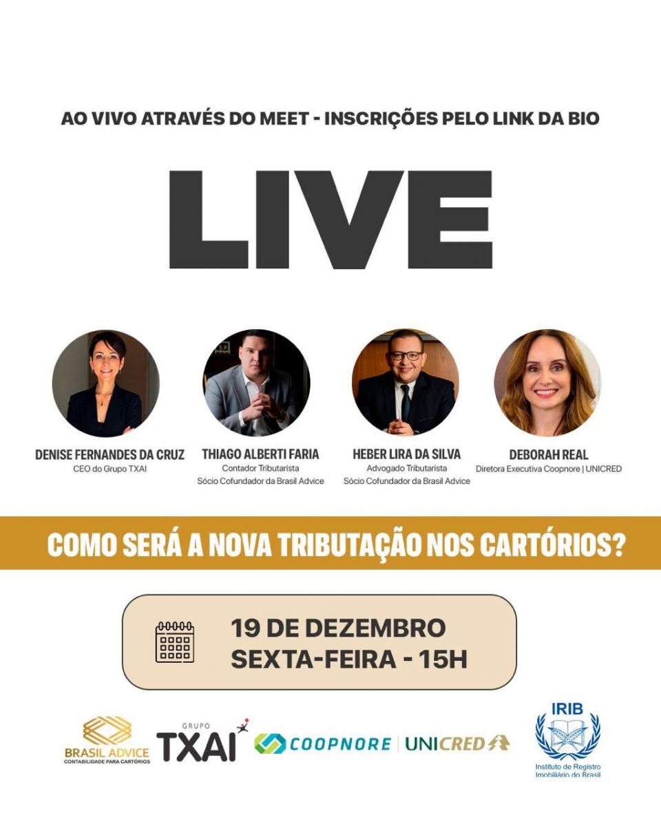 Um dos assuntos mais relevantes do momento diz respeito à Reforma Tributária e seu impacto nas Serventias Extrajudiciais, especificamente, no que diz respeito à tributação dos Cartórios. Para falar sobre o tema, o Grupo TXAI, em parceria com a Brasil Advice e a Coopnore UNICRED, com o apoio do Instituto de Registro Imobiliário do Brasil (IRIB), promoverão uma live amanhã, 19/12/2025, a partir das 15h.