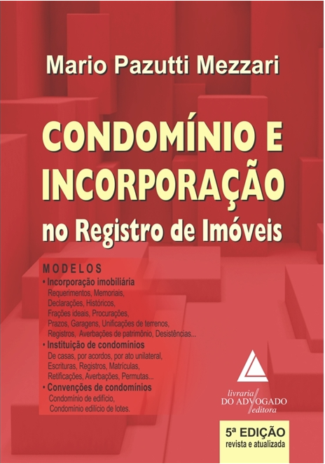 Publicada Editora Livraria do Advogado em 2020, a 5ª Edição Revista e Ampliada da obra intitulada “Condomínio e Incorporação no Registro de Imóveis”, escrita pelo Oficial de Registro de Imóveis da 1ª Zona de Pelotas/RS e Ex-Presidente do Colégio Registral do Rio Grande do Sul, Mario Pazutti Mezzari, tem como objetivo analisar questões pertinentes às incorporações imobiliárias e ao condomínio edilício, ambos regidos pela Lei n. 4.591/64.