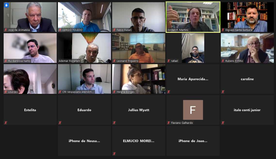 Conforme divulgado na edição anterior do Boletim do IRIB, o Conselho Deliberativo, o Conselho Fiscal e a Diretoria do Instituto de Registro Imobiliário do Brasil (IRIB), além de outros convidados, participaram de reunião virtual realizada ontem, 08/07/2021, às 15h. A pauta da reunião foi composta por assuntos relativos ao Relatório de Atividades do IRIB; ao planejamento para as próximas ações do Instituto; ao acompanhamento dos projetos de lei em trâmite que tratam do teto emolumentar e aos projetos de reforma dos Cartórios da Bahia e de criação de um memorial de som e imagem destinado para preservação da memória do Registro de Imóveis.