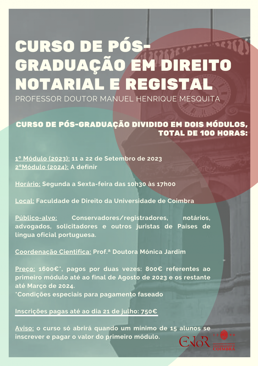 O Centro de Estudos Notariais e Registais (CENoR) da Faculdade de Direito da Universidade de Coimbra/Portugal (FDUC) promoverá o “Curso de Pós-Graduação em Direito Notarial e Registal – Professor Doutor Manuel Henrique Mesquita”. O curso, dividido em dois módulos, será realizado presencialmente na FDUC entre os dias 11 a 22 de setembro (1º Módulo), com aulas de segunda a sexta-feira, das 10h30 às 17h (horário de Portugal).
