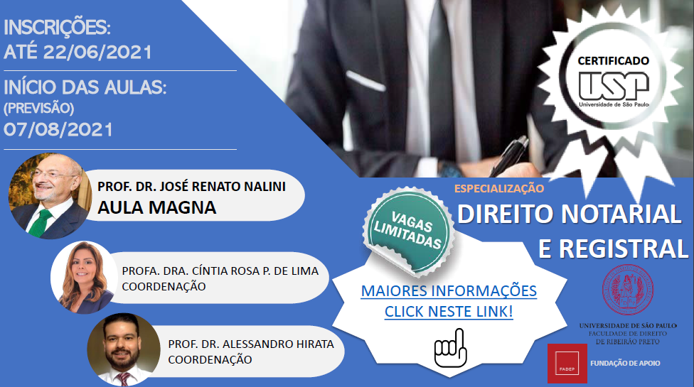 Sob a Coordenação da Profa. Dra. Cíntia Rosa Pereira de Lima e do Prof. Dr. Alessandro Hirata, a Faculdade de Direito de Ribeirão Preto da Universidade de São Paulo (USP), em convênio com a Fundação para o Desenvolvimento do Ensino e da Pesquisa do Direito (FADEP) promove a 2ª edição do seu Curso de Pós-Graduação (Lato Sensu) em Direito Notarial e Registral.