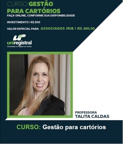 A Universidade Corporativa do Registro de Imóveis (UNIREGISTRAL) promove o curso intitulado “Gestão para Cartórios”, ministrado por Talita Caldas. Conforme divulgado anteriormente, em virtude da parceria firmada com o Instituto de Registro Imobiliário do Brasil (IRIB), associados ao Instituto terão desconto de 20% no valor da inscrição.