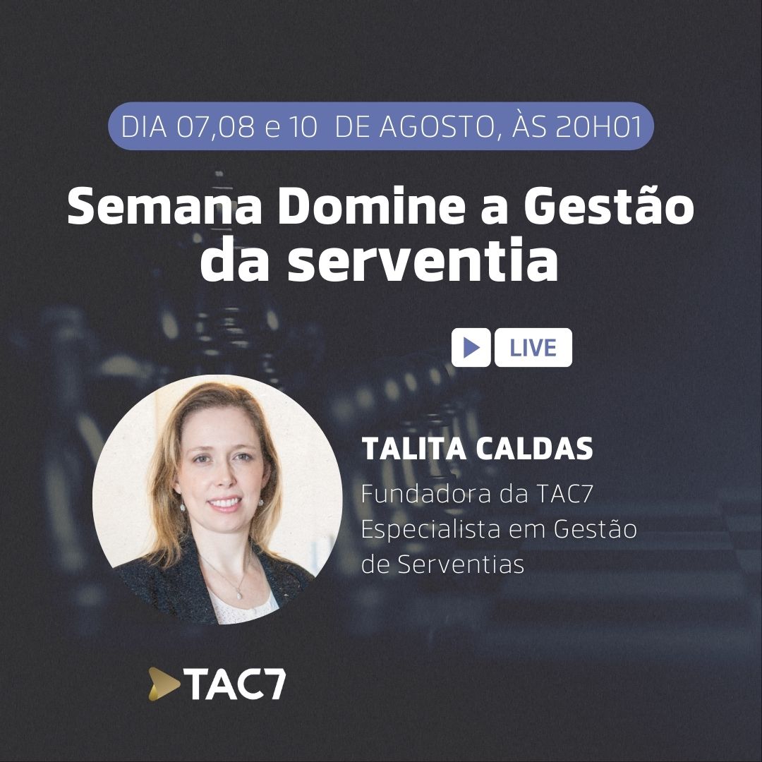 Com o objetivo de orientar Titulares do Extrajudicial nas melhores técnicas de gestão do Cartório, a TAC7, empresa voltada ao treinamento e desenvolvimento gerencial dos Titulares, Substitutos e Administradores de Cartórios, oferecerá três aulas 100% online e gratuitas acerca de temas que estão em alta sobre Gestão do Extrajudicial. As aulas serão realizadas nos dias 07, 08 e 10 de agosto, às 20h, no canal do YouTube da TAC7.