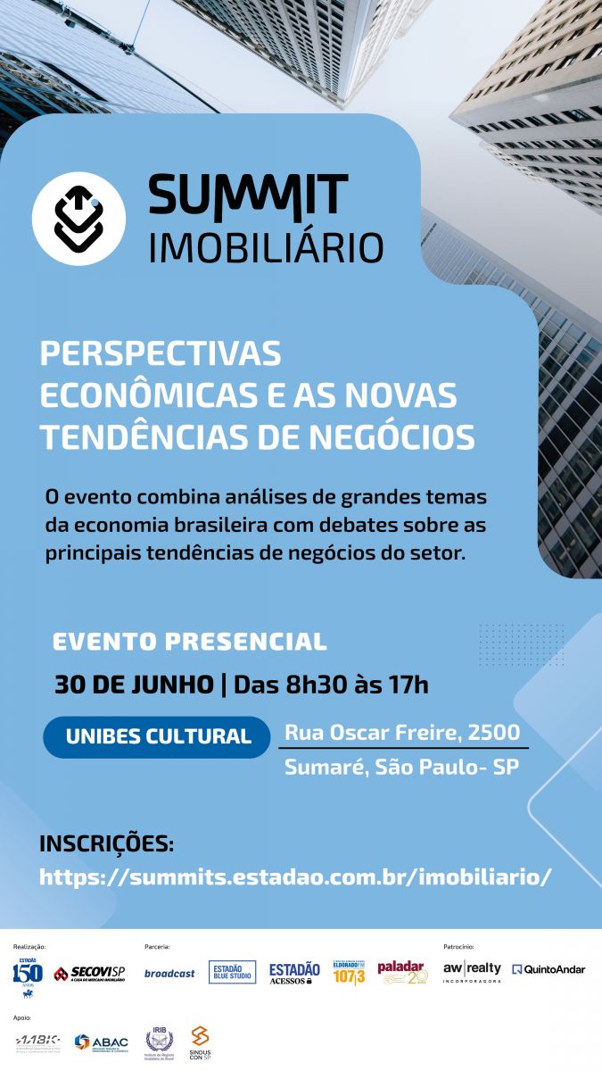 O Grupo Estadão e o SECOVI-SP realizarão, em 30/06/2025, o evento gratuito intitulado “Summit Imobiliário 2025”, que debaterá perspectivas econômicas e as novas tendências de negócios do mercado imobiliário. O evento, que combina análises de grandes temas da economia brasileira com debates sobre as principais tendências de negócios do setor, acontecerá na Unibes Cultural, localizada na Rua Oscar Freire, 2500, Sumaré, São Paulo/SP, das 8h30 às 17h e reunirá autoridades, jornalistas e especialistas no setor. O Instituto de Registro Imobiliário do Brasil (IRIB) é um dos apoiadores do evento e as inscrições já estão abertas.
