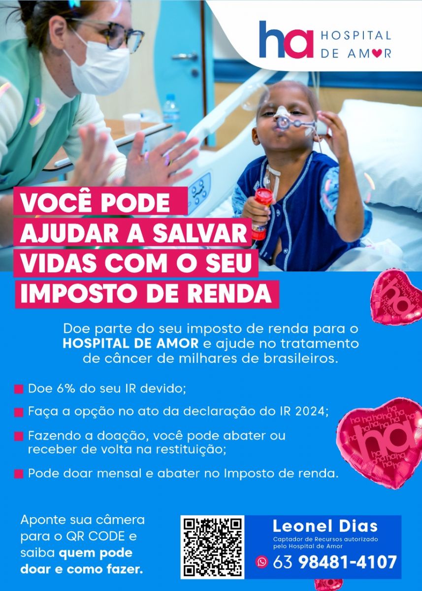 Para saber como doar, entre em contato com Leonel Dias, Captador de Recursos Autorizado pelo Hospital de Amor (WhatsApp: 63 – 98481-4107):