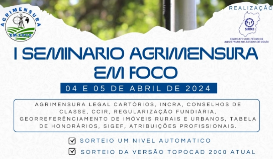 O Instituto Federal de Goiás (IFGO), o Sindicato dos Técnicos Industriais no Estado de Goiás (SINTEC-GO) e o Conselho Regional dos Técnicos Industriais da 1ª Região (CRT-01) promoverão, nos dias 4 e 5 de abril, no IFG – Campus Goiânia, o “I Seminário Agrimensura em Foco”, que debaterá temas como Agrimensura Legal e Cartórios; regularização fundiária e georreferenciamento de imóveis rurais e urbanos, dentre outros. O evento contará com a participação do Vice-Presidente do Instituto de Registro Imobiliário do Brasil (IRIB), José de Arimatéia Barbosa. O seminário é gratuito e limitado apenas a 120 vagas.