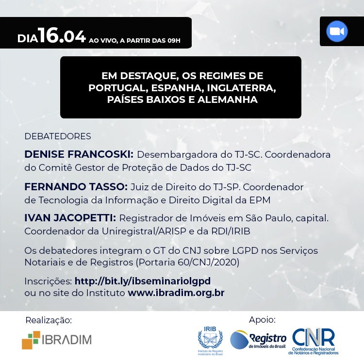 No dia 16/04/2021, ao vivo, a partir das 9h, o Instituto Brasileiro de Direito Imobiliário (IBRADIM) realizará o Seminário Internacional sobre Proteção de Dados nos Registros Imobiliários. No evento, serão discutidos modelos regulatórios na Europa com demonstrações práticas de soluções para os conflitos ou potenciais conflitos entre publicidade registral e a privacidade e a proteção de dados, focando-se na realidade dos registros imobiliários.