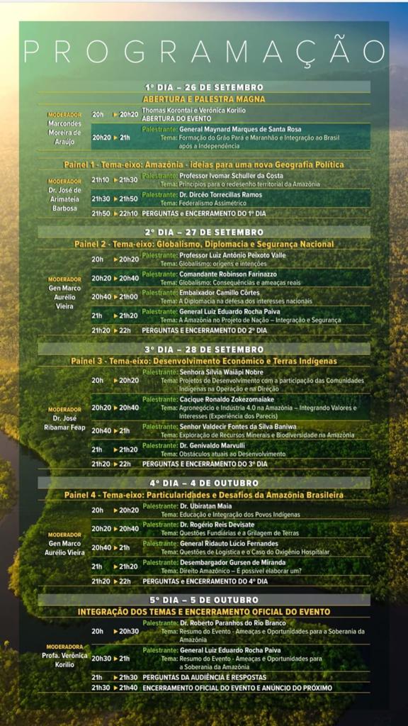 Os Institutos Sagres e Federalista promoveram o “III Simpósio Amazônia Brasileira, Nossa para Sempre”. Na quinta e última noite de palestras, transmitida ao vivo a partir das 20h e realizada em 05/10/2022, o evento tratou da integração dos temas e do encerramento do evento. De acordo com a programação divulgada, o painel teve como Moderadora Verônica Korilio.
