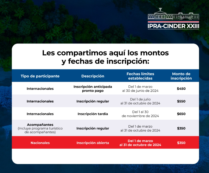 O XXIII Congreso Internacional de Derecho Registral IPRA-CINDER, evento promovido pela International Property Registries Association – Centro Internacional de Derecho Registral (IPRA-CINDER), organização internacional independente e de estrutura aberta de instituições acadêmicas e profissionais relacionadas à especialidade do direito de registro de propriedade imobiliária, divulgou a sua tabela de prazos e valores para inscrição no evento.