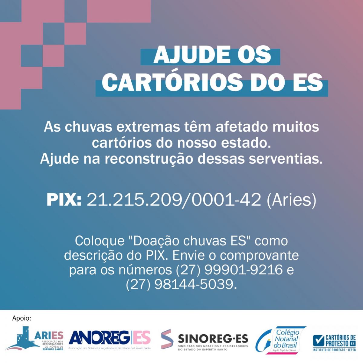 Conforme noticiado pelo Boletim do IRIB, a iniciativa foi criada pela Associação dos Registradores de Imóveis do Espírito Santo (ARIES); pela Associação dos Notários e Registradores do Estado do Espírito Santo (ANOREG/ES); pelo Sindicato dos Notários e Registradores do Estado do Espírito Santo (SINOREG/ES); pelo Colégio Notarial do Brasil – Seção Espírito Santo; e pelo Instituto de Estudos de Protesto de Títulos do Brasil – Seção Espírito Santo (IEPTB/ES), que se uniram para arrecadar doações para o auxílio das vítimas decorrentes das fortes chuvas que assolam o Estado, provocando inúmeros danos, inclusive nas Serventias Extrajudiciais das cidades atingidas.