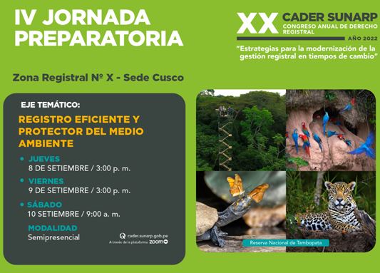 A Superintendencia Nacional de los Registros Públicos (SUNARP) promoverá, nos dias 08, 09 e 10 de setembro, em formato semipresencial, a “IV Jornada Preparatoria al XX CADER SUNARP: Registro eficiente y protector del medio ambiente”, que será realizada presencialmente na cidade de Puerto Maldonado/Peru e transmitida virtualmente pelo Zoom. Nesta Jornada Preparatória, renomados especialistas compartilharão conhecimentos, experiências e opiniões acerca do registro e da proteção ao meio ambiente. Serão conferidos certificados aos participantes.