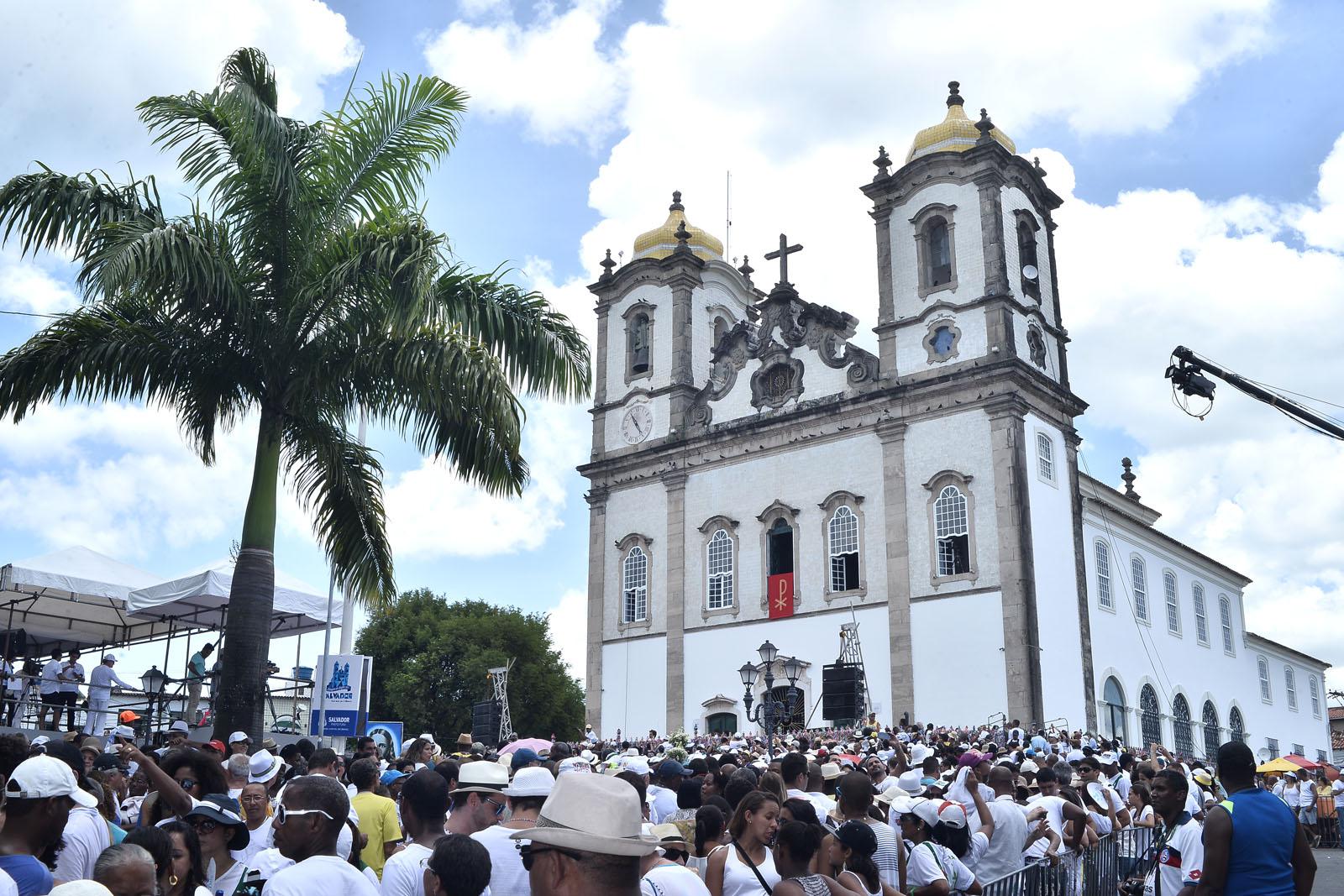 Descrição da imagem: multidão trajando roupas brancas reunida em frente à Igreja do Senhor do Bonfim em Salvador [fim da descrição].