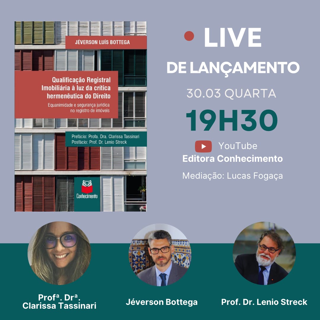 A Editora Conhecimento promoverá, no dia 30/03/2022, uma live para o lançamento da obra de autoria de Jéverson Luís Bottega, intitulada “Qualificação Registral Imobiliária à luz da Crítica Hermenêutica do Direito – Equanimidade e segurança jurídica no registro de imóveis”.