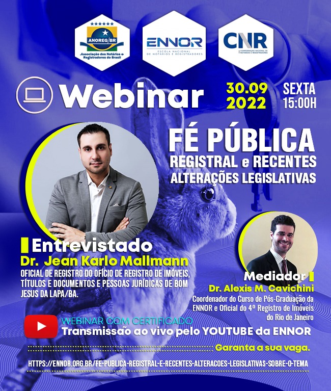 A Escola Nacional de Notários e Registradores (ENNOR), mantida pela Associação dos Notários e Registradores do Brasil (ANOREG-BR) e pela Confederação Nacional de Notários e Registradores (CNR) realizará, no dia 30/09/2022, às 15h, um webinar com o Oficial de Registro de Imóveis, Títulos e Documentos e Pessoas Jurídicas de Bom Jesus da Lapa/BA e membro da Comissão do Pensamento Registral Imobiliário do Instituto de Registro Imobiliário do Brasil (CPRI/IRIB), Jean Karlo Woiciechoski Mallmann. A entrevista será conduzida pelo Oficial do 4º Registro de Imóveis do Rio de Janeiro/RJ, Diretor da Escola de Notários e Registradores do Rio de Janeiro (ENOREG/RJ) e Coordenador do curso de pós-graduação da ENNOR, Alexis Mendonça Cavichini Teixeira de Siqueira.