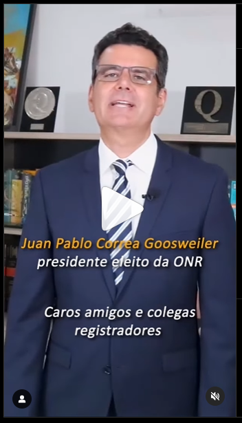 O Presidente eleito para o triênio 2024/2026 do Operador Nacional do Sistema de Registro Eletrônico de Imóveis (ONR), Juan Pablo Correa Gossweiler, eleito na última sexta-feira, 24/11/2023, enviou uma mensagem na conta do Instagram do ONR, em agradecimento pela confiança e reafirmando seu comprometimento com as ações que serão desenvolvidas em sua gestão. Conforme divulgado anteriormente, as Chapas “União e Transformação” e “ONR para Todos”, candidatas à Diretoria Executiva do ONR, formalizaram uma composição e formaram a Chapa Única “Integração Nacional”, encabeçada por Gossweiler.