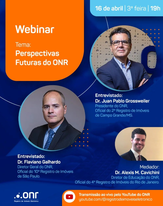 O Operador Nacional do Sistema de Registro Eletrônico de Imóveis (ONR) promoverá hoje, 16/04/2024, a partir das 19h (horário de Brasília), o webinar intitulado “Perspectivas Futuras do ONR”. O webinar será transmitido pelo canal do ONR no YouTube.