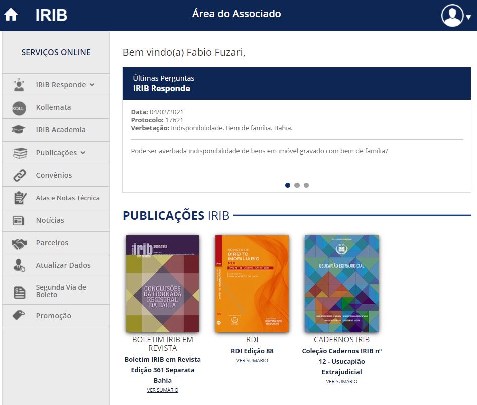 Os associados ao IRIB possuem acesso exclusivo à “Área do Associado”, que disponibiliza serviços e conteúdos como o “IRIB Responde” (cujo envio de perguntas é exclusivo aos Oficiais de Registros de Imóveis); o acesso às publicações disponibilizadas no “IRIB Academia”, às atas de reuniões etc. Além disso, recebem gratuitamente, seja em formato físico ou digital, todas as publicações produzidas, a partir do momento de sua associação, e se beneficia de descontos nas inscrições dos cursos e eventos promovidos pelo IRIB.