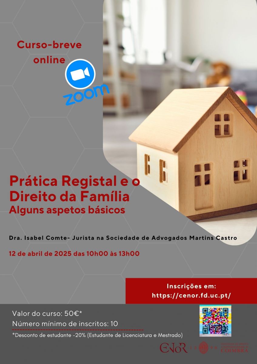 O Centro de Estudos Notariais e Registais (CENoR) da Faculdade de Direito da Universidade de Coimbra/Portugal (FDUC), promoverá o curso “Prática Registal e o Direito da Família – Alguns aspectos básicos”. O curso será online e transmitido no dia 12/04/2025, das 10h às 13h (horário de Portugal). As inscrições poderão ser realizadas até o dia 12/04.
