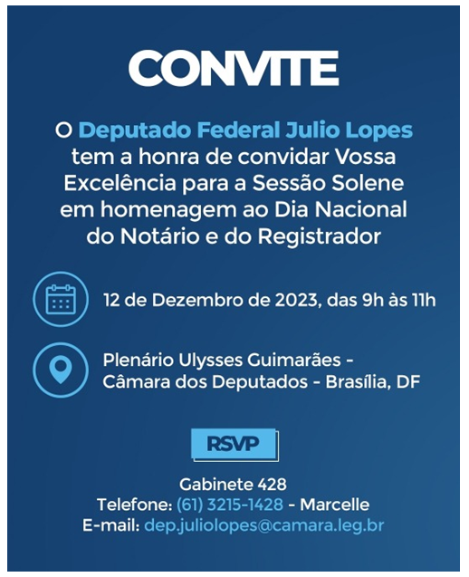 O Presidente do Instituto de Registro Imobiliário do Brasil (IRIB), Jordan Fabrício Martins, foi convidado pelo Gabinete do Deputado Federal Julio Lopes para participar da Sessão Solene em Homenagem ao Dia Nacional do Notário e do Registrador, que será realizada no dia 12 de dezembro de 2023, a partir das 9h, na Câmara dos Deputados, Plenário Ulysses Guimarães, em Brasília/DF.