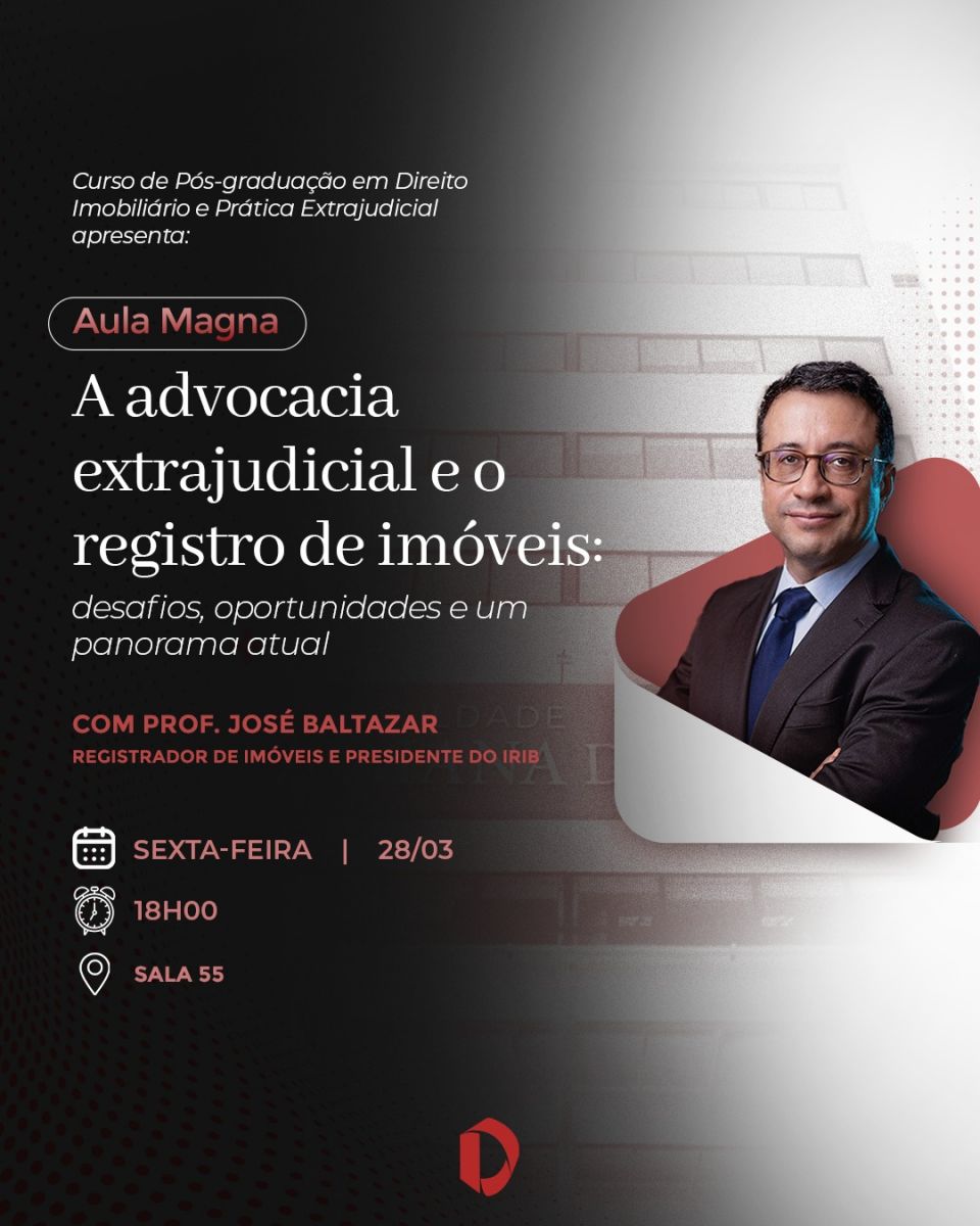 O Presidente do Instituto de Registro Imobiliário do Brasil (IRIB), José Paulo Baltazar Junior, ministrará a Aula Magna intitulada “A advocacia extrajudicial e o registro de imóveis: desafio, oportunidades e um panorama atual”. A aula integra o programa do curso de pós-graduação em Direito Imobiliário e Prática Extrajudicial da Faculdade Baiana de Direito e Gestão e será realizada em formato híbrido, a partir das 18h, com transmissão pela plataforma Zoom. O acesso aos associados do IRIB à palestra será gratuito.