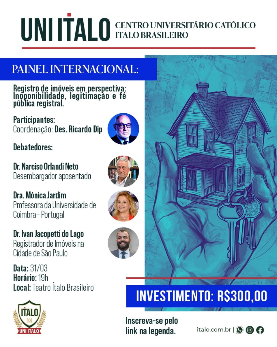 O Centro Universitário Católico Ítalo Brasileiro (UNI ÍTALO) promoverá, em formato híbrido, no dia 31 de março de 2025, a partir das 19h, o painel internacional “Registro de Imóveis em perspectiva: inoponibilidade, legitimação e fé pública registral”. O evento será realizado no Teatro Ítalo Brasileiro. Para participar do painel, faça sua inscrição aqui.