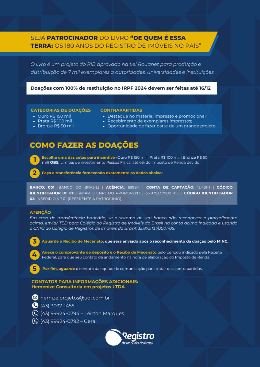 O Registro de Imóveis do Brasil (RIB) busca captar patrocinadores para arrecadar fundos para a produção do livro “De quem é essa terra: os 180 anos do Registro de Imóveis brasileiro”. O objetivo é produzir e distribuir 7 mil exemplares para autoridades, universidades e instituições. O projeto conta com aprovação na Lei Rouanet e os valores, captados por doação, serão 100% restituídos no Imposto de Renda (IRPF 2024), se doados até o dia 16/12/2024.