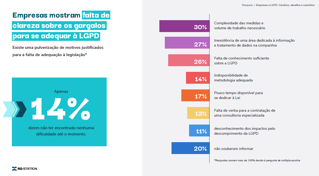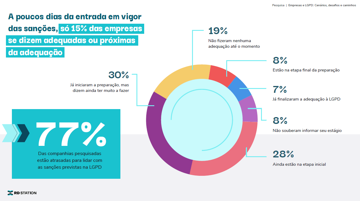 Segundo o portal InfoMoney, em pesquisa divulgada pela empresa de tecnologia RD Station, em parceria com a Manar Soluções em Pesquisa e Eduardo Dorfmann Aranovich e Cia Advogados, onde foram pesquisadas 997 empresas, apenas 15% delas se mostram prontas ou na reta final de preparação para a entrada em vigor das sanções: