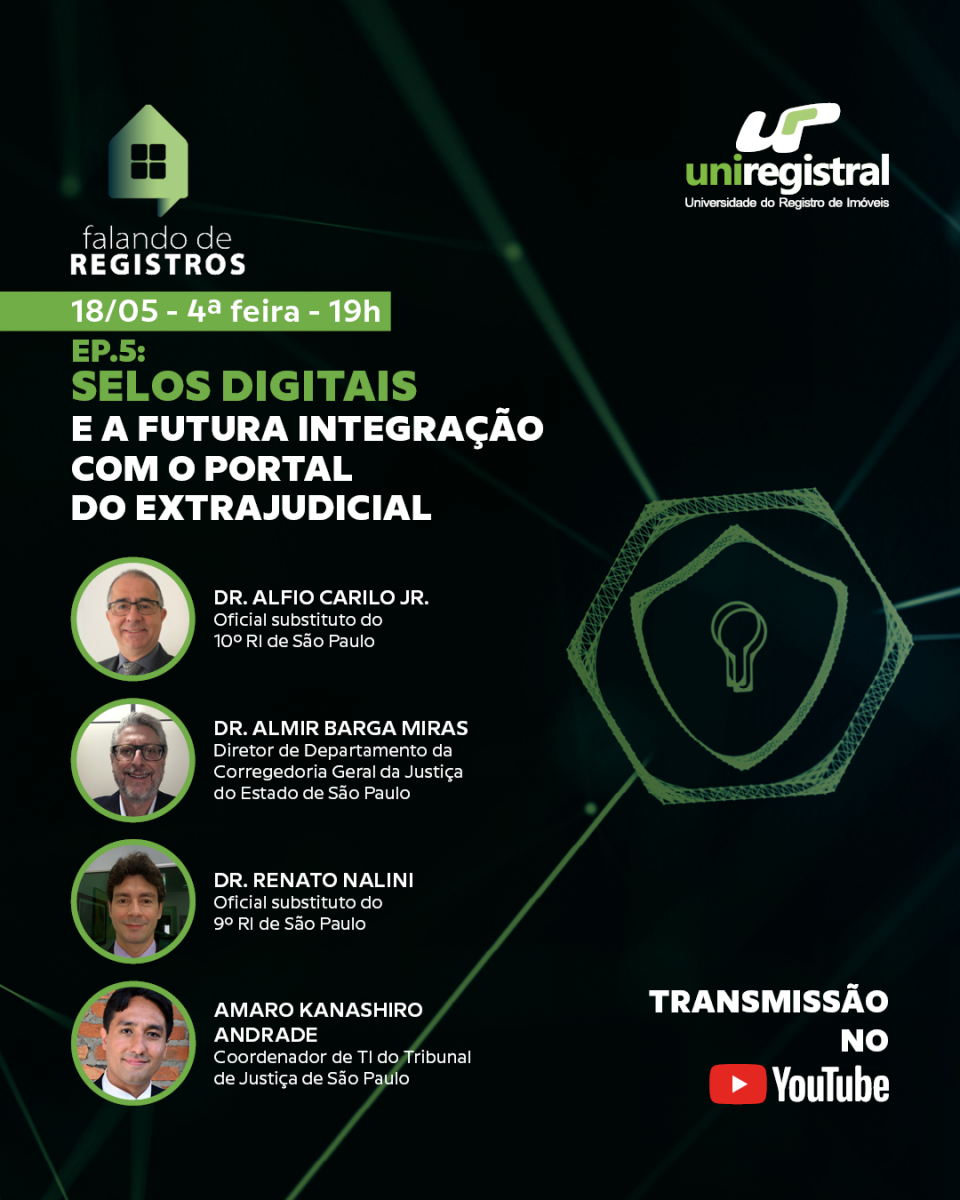 A Universidade Corporativa do Registro de Imóveis (UNIREGISTRAL) promoverá uma live intitulada “Selos Digitais e a futura integração com o Portal do Extrajudicial”. A transmissão será realizada no dia 18/05/2022, a partir das 19h por meio do canal da UNIREGISTRAL, no YouTube. A live faz parte do projeto “Falando de Registros”, cujo objetivo é mostrar o cotidiano do Cartório de Registro de Imóveis para sanar as dúvidas práticas que os colaboradores têm em seu dia a dia.