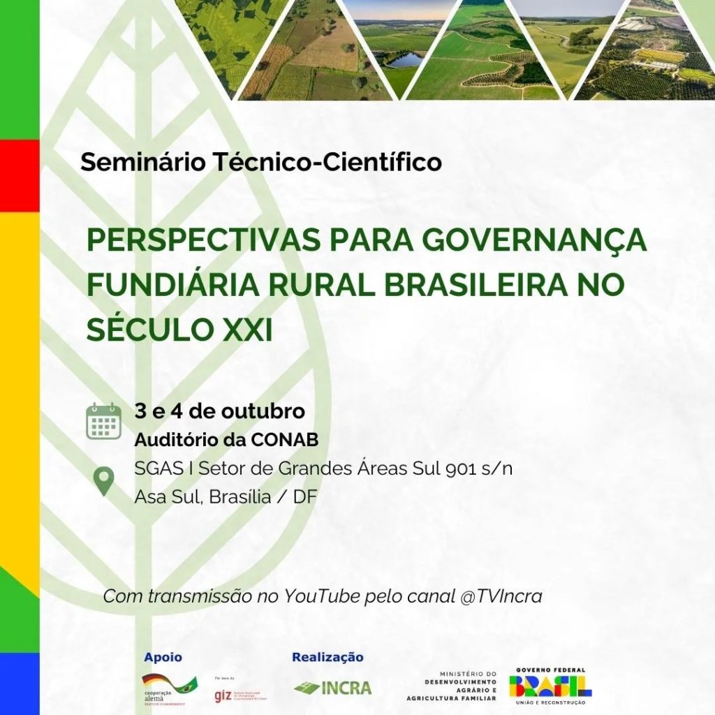 Tema do seminário será “Perspectivas para Governança Fundiária Rural Brasileira no Século XXI”.