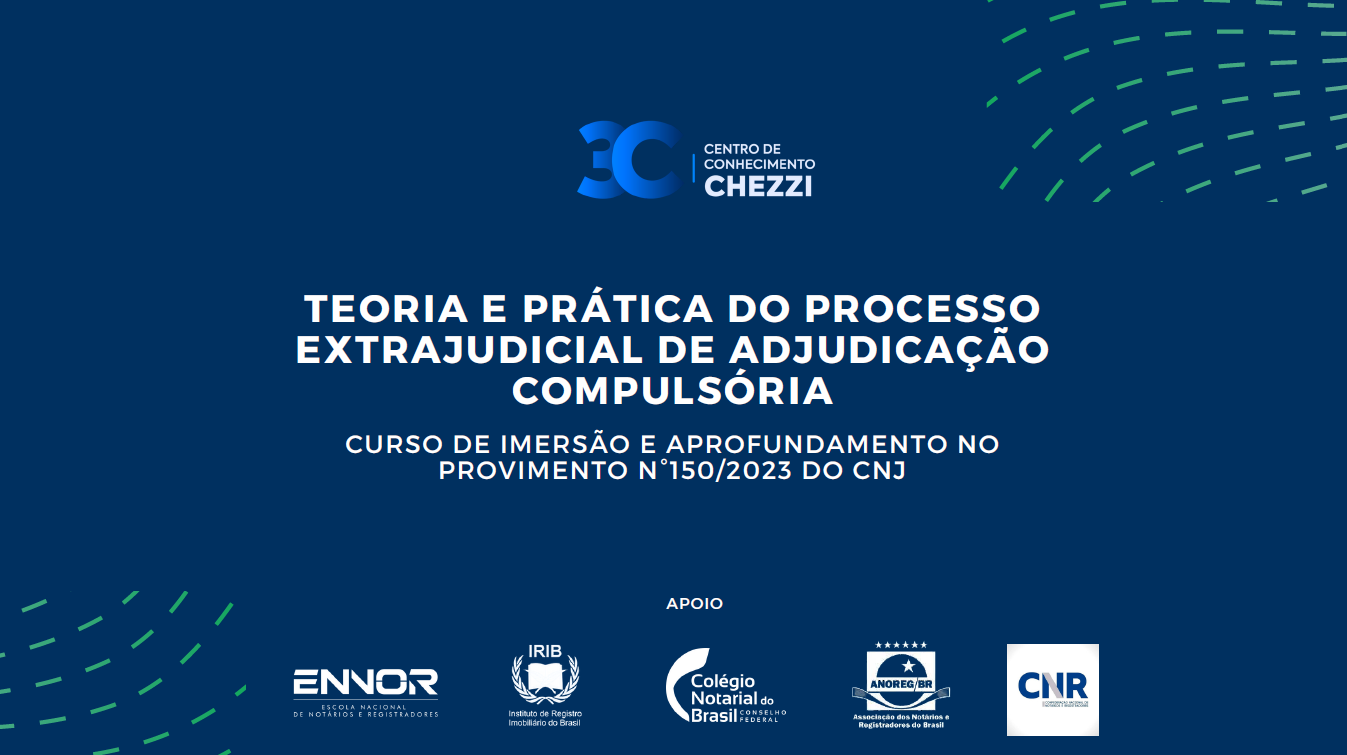A 3C, Escola de Cursos de Aprofundamento em temas do Direito Registral Imobiliário, inicia hoje, 29/09/2023, o pré-lançamento do Curso de Imersão e Aprofundamento no Provimento CN-CNJ n. 150/2023, coordenado pelo especialista em prática notarial e registral Professor Bernardo Chezzi, que também é membro do Conselho Consultivo da Corregedoria Nacional de Justiça do Conselho Nacional de Justiça (CN-CNJ), tendo sido o Relator dos estudos e da proposta de regulamentação da Adjudicação Compulsória Extrajudicial. As vagas são limitadas e os associados ao Instituto de Registro Imobiliário do Brasil (IRIB) têm 20% de desconto e podem garantir sua vaga ainda no pré-lançamento, no site Eduzz!