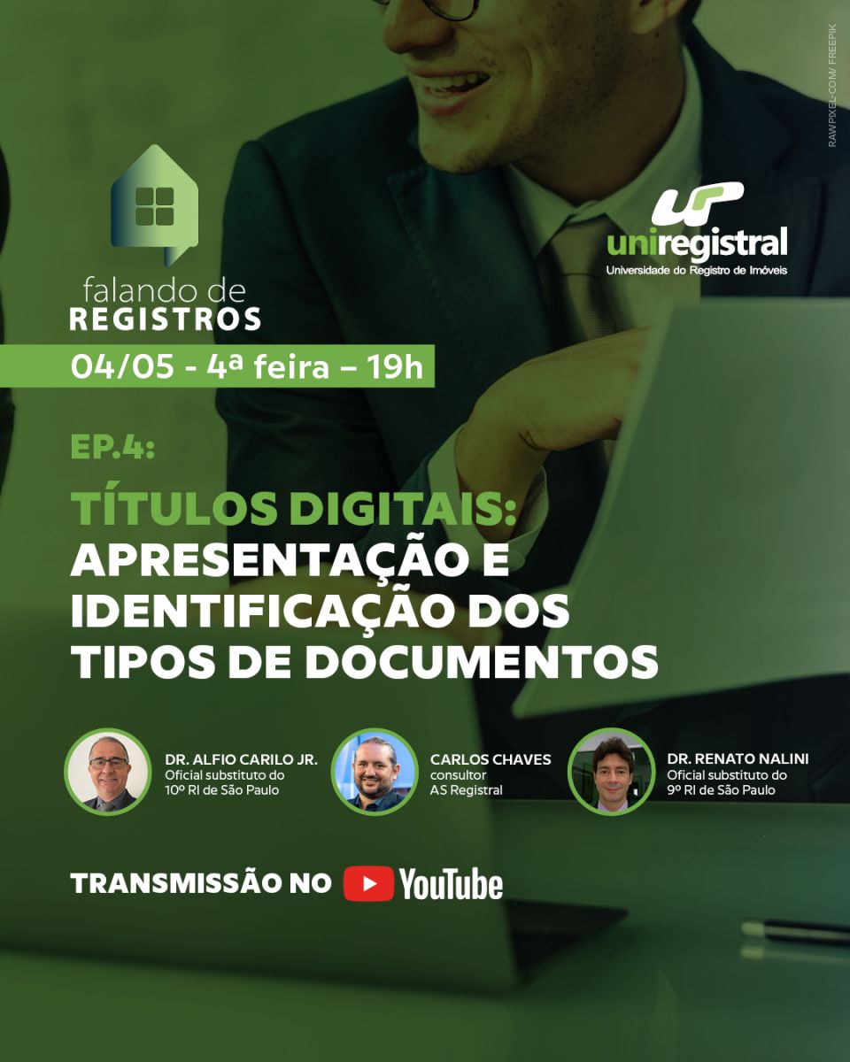 A Universidade Corporativa do Registro de Imóveis (UNIREGISTRAL) promoverá uma live intitulada “Títulos Digitais: Apresentação e Identificação dos Tipos de Documentos”. A transmissão será realizada a partir das 19h por meio do canal da UNIREGISTRAL, no YouTube. A live faz parte do projeto “Falando de Registros”, cujo objetivo é mostrar o cotidiano do Cartório de Registro de Imóveis para sanar as dúvidas práticas que os colaboradores têm em seu dia a dia.