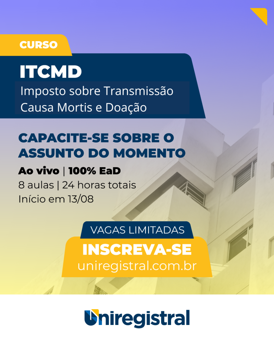 A Universidade do Registro de Imóveis (UNIREGISTRAL) promoverá o curso intitulado “Imposto sobre Transmissão Causa Mortis e Doação de Quaisquer Bens e Direitos” (ITCMD), que possibilitará aos inscritos uma imersão profunda nos conceitos, práticas e regulamentações do referido tributo. Ministrado por especialistas renomados na área, o curso será composto de 8 aulas e 24 horas de treinamento, com emissão de Certificado. Os associados ao Instituto de Registro Imobiliário do Brasil (IRIB) terão 20% de desconto no valor da inscrição, que poderá ser efetuada somente até o dia 16/08/2024.