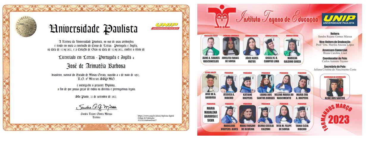 Veja o Diploma de Licenciado em Letras – Português e Inglês conferido à José de Arimatéia Barbosa, bem como a relação dos Formandos do mês de março de 2023: