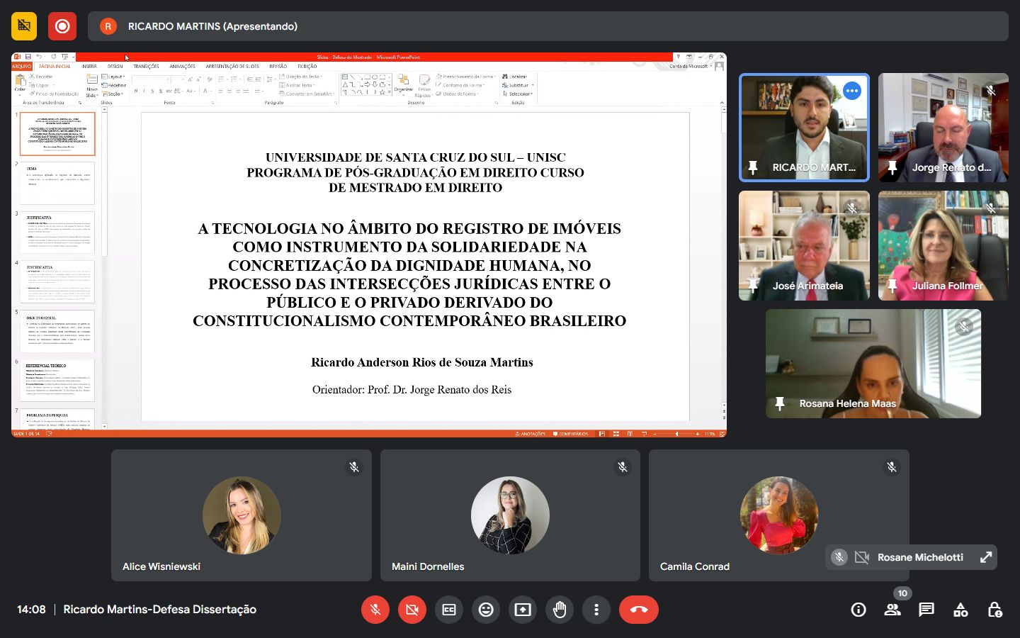 A tese defendida por Ricardo Martins recebeu o título de “A TECNOLOGIA NO ÂMBITO DO REGISTRO DE IMÓVEIS COMO INSTRUMENTO DA SOLIDARIEDADE NA CONCRETIZAÇÃO DA DIGNIDADE HUMANA, NO PROCESSO DAS INTERSECÇÕES JURÍDICAS ENTRE O PÚBLICO E O PRIVADO DERIVADO DO CONSTITUCIONALISMO CONTEMPORÂNEO BRASILEIRO”. Também participaram da banca examinadora o Prof. Dr. Jorge Renato dos Reis, como Orientador, e as Profas. Dras. Rosana Helena Maas e Juliana Follmer Bortolin Lisboa.
