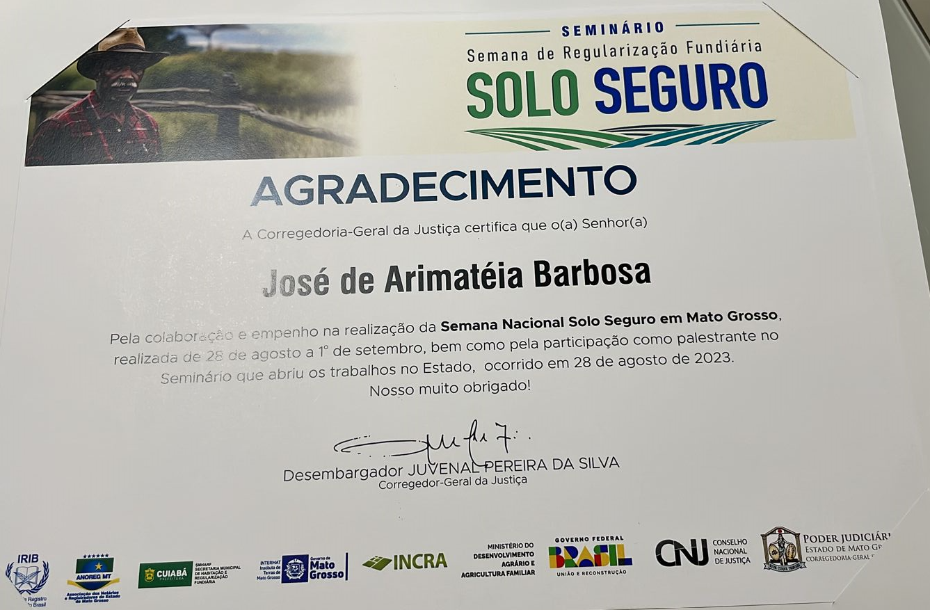 Para iniciar a Semana Nacional de Regularização Fundiária no Estado de Mato Grosso, o Tribunal de Justiça do Estado de Mato Grosso (TJMT) e a Corregedoria-Geral da Justiça do Estado (CGJ/MT) promoveram o seminário “Semana Nacional de Regularização Fundiária Solo Seguro”, realizado na tarde de ontem, 28/09/2023, em formato híbrido, na sede do Poder Judiciário de Mato Grosso e com transmissão por videoconferência pela plataforma Microsoft Teams e pelo canal oficial do TJMT no YouTube. O Vice-Presidente do Instituto de Registro Imobiliário do Brasil (IRIB), José de Arimatéia Barbosa, foi um dos palestrantes no evento.