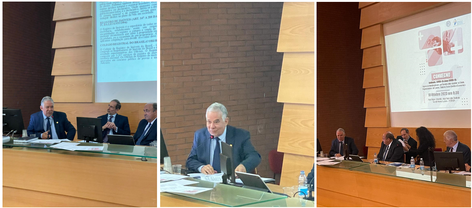 Na Università degli Studi della Basilicata, localizada na cidade de Potenza/Itália, foi realizada a conferência intitulada “CONVEGNO – Ambiente, COVID-19 e long COVID-19: Approccio Interdisciplinare per l’analisi delle ricadute su Salute, Organizzazione del Lavoro, Sistema Socio-Giuridico-Economico”. O evento debateu os efeitos da pandemia de COVID-19 na Saúde, Organização do Trabalho e no Sistema Sócio-Jurídico-Econômico. José de Arimatéia participou de painel coordenado por Francisco Albero Magin Ferrer e por Irene Coppola. O Vice-Presidente palestrou sobre o Registro Imobiliário no Brasil durante a pandemia em conjunto com Karine Boselli, Registradora Civil das Pessoas Naturais em São Paulo/SP. Integraram a coordenação do evento e seu Comitê Científico: Carmine Serio (Coordenador), Irene Coppola, Lucila Córdoba, Michele Greco, Guido Masiello, Luigi Milella e Beniamino Murgante.