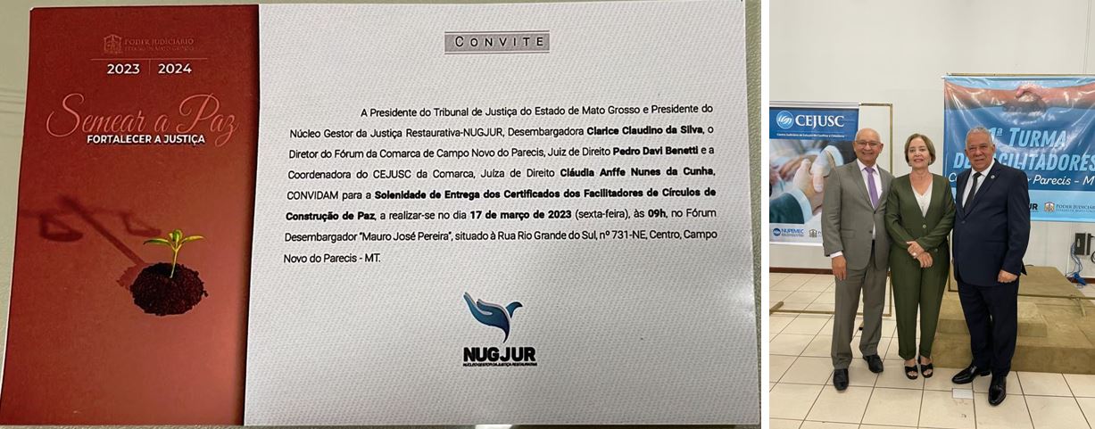 O convite para participação no evento foi encaminhado para José de Arimatéia pela Presidente do TJMT e do Núcleo Gestor da Justiça Restaurativa (NUGJUR), Desembargadora Clarice Claudino da Silva; pelo Diretor do Fórum da Comarca de Campo Novo do Parecis, Juiz de Direito Pedro Davi Benetti; e pela Coordenadora do Centro Judiciário de Solução de Conflitos e Cidadania (CEJUSC) da Comarca, Juíza de Direito Cláudia Anffe Nunes da Cunha.