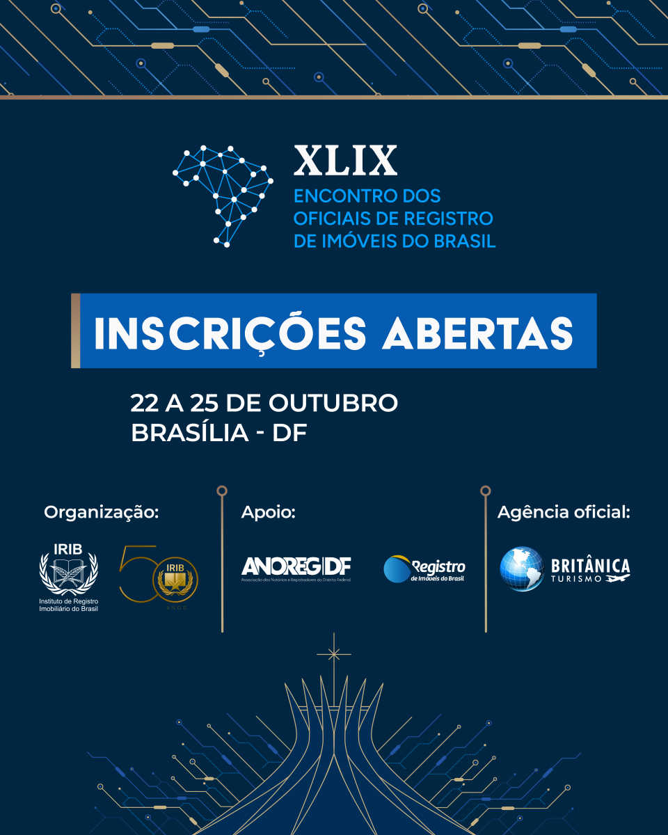 É com imensa satisfação que a Diretoria do Instituto de Registro Imobiliário do Brasil (IRIB), representada por seu Presidente, Jordan Fabrício Martins, e por seu Vice-Presidente, José de Arimatéia Barbosa, ANUNCIA que as inscrições para o XLIX Encontro dos Oficiais de Registro de Imóveis do Brasil, tradicional evento promovido pelo IRIB, estão OFICIALMENTE ABERTAS! O XLIX Encontro será realizado entre os dias 22 e 25 de outubro, em Brasília/DF, ocasião em que também será celebrado o 50º ANIVERSÁRIO DO IRIB, tornando o evento um momento especial e único na história do Instituto!