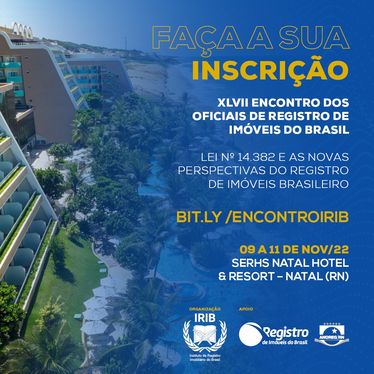 O Instituto de Registro Imobiliário do Brasil (IRIB) informa que o prazo para reservas de hospedagem com tarifas especiais para o XLVII ENCONTRO DOS OFICIAIS DE REGISTRO DE IMÓVEIS DO BRASIL foi prorrogado até o dia 18/09/2022. O evento, que será realizado nos dias 09 a 11/11/2022 no SERHS NATAL GRAND HOTEL & RESORT, localizado na cidade de NATAL/RN, contará com o apoio do Registro de Imóveis do Brasil (RIB) e da Associação dos Notários e Registradores do Estado do Rio Grande do Norte (ANOREG/RN). O tema principal do XLVII Encontro será a Lei n. 14.382/2022 e as novas perspectivas do Registro de Imóveis brasileiro.