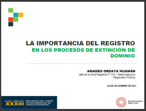 Prosseguindo com a divulgação dos trabalhos apresentados no XXXIII Encuentro del Comité Latinoamericano de Consulta Registral, organizado pela Superintendencia Nacional de los Registros Públicos (SUNARP), o Boletim do IRIB selecionou, para esta edição, a apresentação do trabalho de Amadeo Ordaya Huamán, intitulado “La importancia del registro en los procesos de extinción de dominio”.